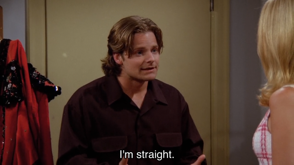 『프렌즈』 시즌 2 4화에는 피비와 혼인 신고를 한 게이 아이스 댄서 덩컨(Duncan)이 나온다. 덩컨은 원래 자신이 게이인 줄 알았고, 미국 영주권을 얻으려 피비와 혼인 신고를 했다. 사실 피비는 덩컨을 좋아했지만 그 마음을 숨겼다. 이후 덩컨은 피비를 찾아와 이혼을 부탁한다. 덩컨은 자신이 알고 보니 이성애자였고 결혼할 여자가 있다며 피비에게 이혼해 달라고 한다. 덩컨이 피비에게 (사실 이성애자라고) 커밍아웃을 한 것이다. 이 신에서는 일반적 커밍아웃의 클리셰를 덩컨의 커밍아웃에 적용해 코미디를 구성한다.