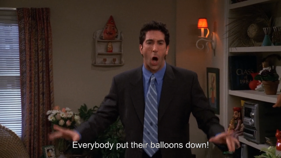 나는 『프렌즈』에서 엘리자베스가 물풍선 싸움을 하는 에피소드(시즌 6 24화)를 좋아한다. 장난을 멈추라고 화내는 로스가 너무 웃기기 때문이다. “Everybody put their balloons down!”