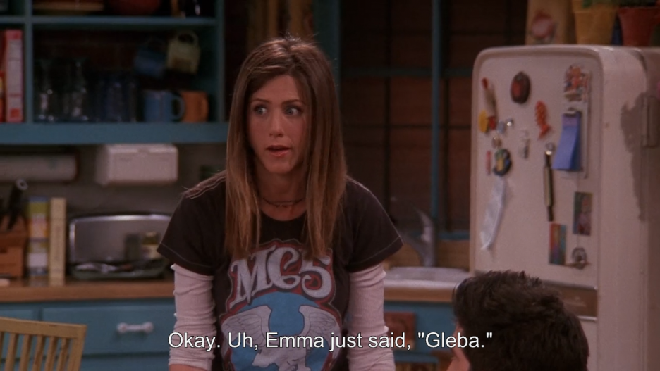 정말 성의 없는 예문이다. 『프렌즈』에 사전이 중요하게 등장하는 에피소드가 세 개(4–3, 9–9, 9–18) 정도 있는데, 그중 시즌 9 18화에서 레이철이 억지스러운 예문을 만든다. 에마가 첫 말을 하지 않을까 기대하는 시기에 에마가 ‘gleba’라는 소리를 낸다. 레이철은 그 소리를 듣고 에마가 처음으로 말을 했다며 기뻐한다. 그러자 로스는 비아냥거리며 레이철에게 gleba를 활용한 문장을 만들어 보라고 한다. 레이철은 “Emma just said gleba.”라는 엉터리 문장을 만든다. 감자칩과 감자튀김의 예문도 거의 이 수준이다. 웃음거리…
