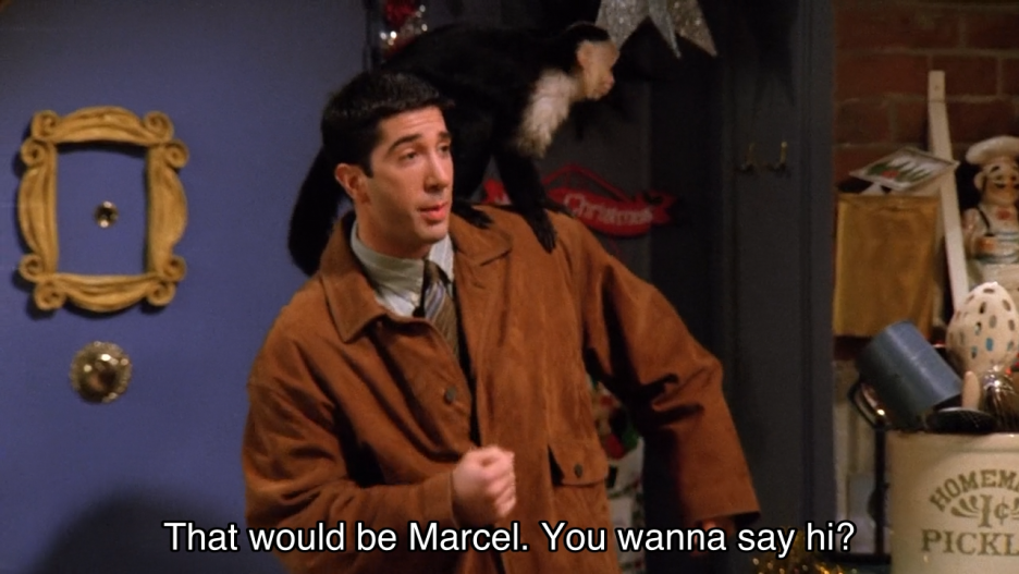 『프렌즈』에는 동물이 많이 나온다. 로스는 초반에 원숭이 마셀(Marcel, 시즌 1 10화에 처음 등장)을 키웠고, 챈들러와 조이는 병아리(Chick, 이후 수탉이 된다. 성체가 되어서도 Chick이라 불린다)와 오리(Duck)를 들였다(시즌 3 21화). 마셀과 병아리, 오리는 비중이 꽤 커서 아예 에피소드 제목도 「The One with the Monkey」, 「The One With a Chick and a Duck」이다.